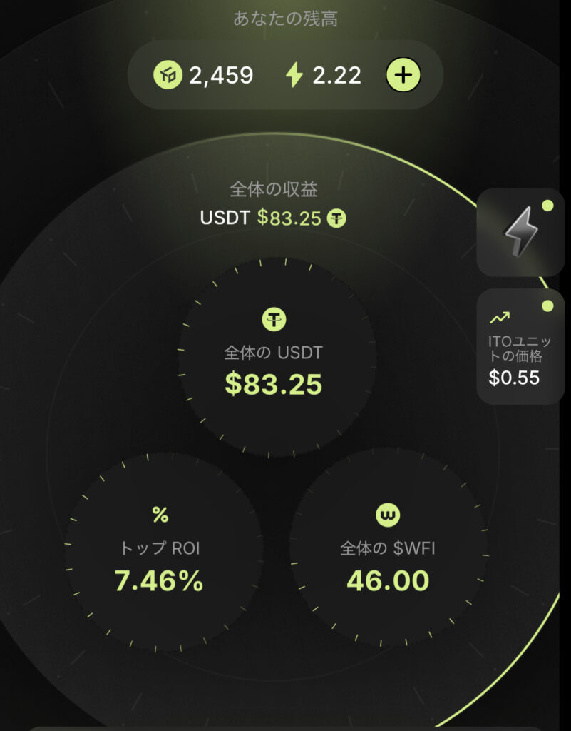 WeFi日記 12日目(2025/11/11) WeFI 2025.11.11 WeFiはじめてから12日目。(元本15万円) WFI46枚 約83ドル=約12,000円 1日当たり=1000円程 半年くらいで元本は超えそうですね。 根気強く検証していきます。 ※投資はリスクがあります!必ず余剰資金で!!